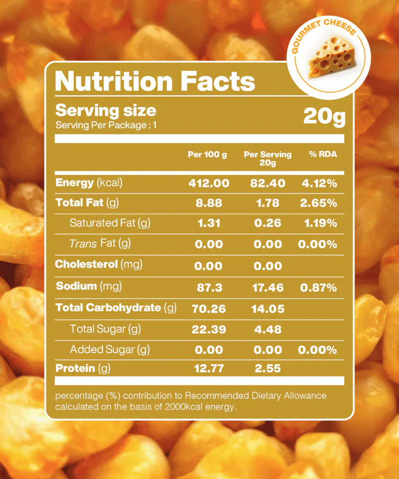 Ingredients : Freeze Dried Sweet Corn (84%), maltose, glucose, sugar, Edible Common salt, lactose, cheese, wheat flour, flavour Enhancer (INS 635), Edible Vegetable oil, Mono & diglycerides of fatty acids (E471) [Contains Added Flavors-Nature Identical Flavouring substances- Cheese]