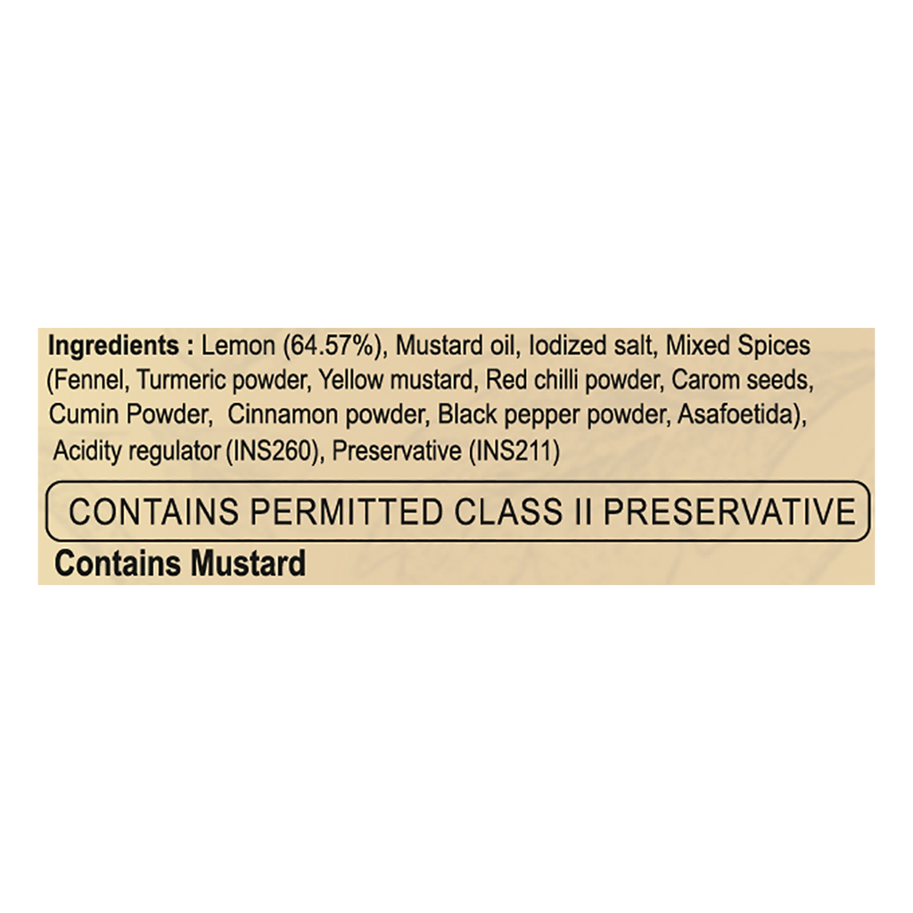 Patanjali Lemon Pickle has the goodness of pure lemon fruit, which is a source of vitamin C. This exquisite lemon pickle is a tangy and zesty condiment that will elevate your culinary experience. The best-quality handpicked lemons are carefully blended with a harmonious combination of aromatic spices, including fennel, turmeric powder, yellow mustard, red chili powder, carom seeds, cumin powder, cinnamon powder, black pepper powder, and asafoetida.