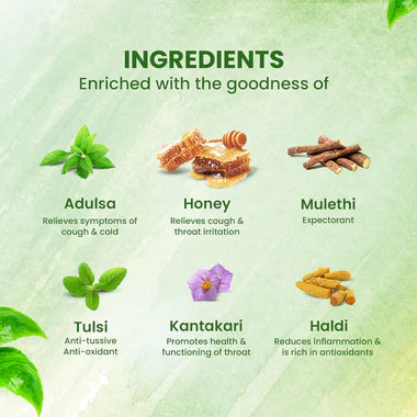 Adulsa, Shunthi, Baheda, Pippali, Mulethi, Kantakari, Tulsi, Haldi, Honey