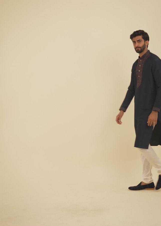 The embroidered neckline adds a touch of traditional charm, while the minimalist design brings a modern, refined appeal. Ideal for weddings, festive occasions, cultural events, and formal gatherings, this kurta churidar set pairs perfectly with embroidered mojaris and a sleek wristwatch for a polished ethnic look.