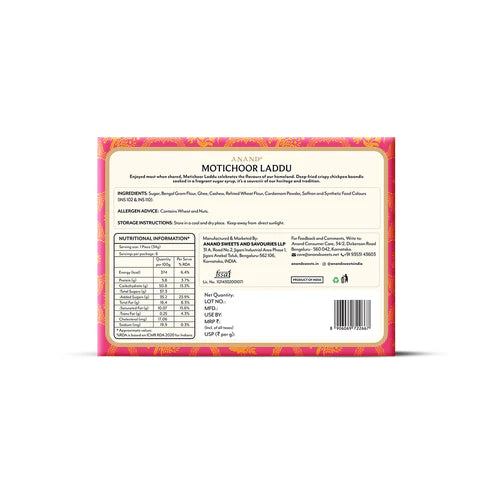 Anand Sweets Motichoor Laddu comes in a tightly-sealed corrugated box that keeps it flavourful and fresh. Once opened, store the box in a cool, dark place or refrigerate and consume the laddus within 15 days from date of purchase.