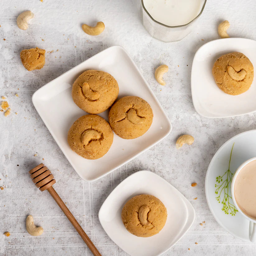 Ingredients :- Refined Wheat Flour (44%), Sugar (20%), Pure Dairy Ghee (18%), Edible Vegetable Fat (Palmolein) (8%), Cashew Bites (5%), Cardamom, Nutmeg, Raising Agent [INS 503(ii), Baking Powder], Contains added flavors (Artificial Flavoring Substance- Ghee).