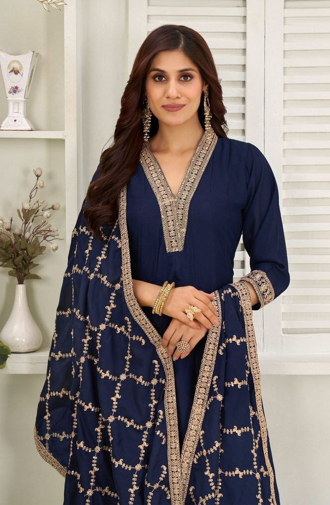 "Pure Vichitra Silk Suit with Intricate Heavy Collar Embroidery, Paired with a Fully Embroidered Heavy Dupatta Featuring Detailed Border Work – A Timeless Ensemble."