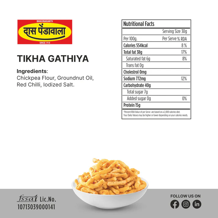 Made in Pure Groundnut Oil. Tikha Gathiya marries the classic texture of gathiya with an assertive spicy kick.