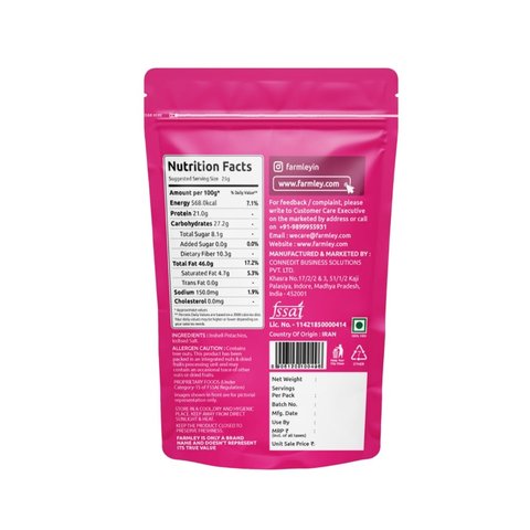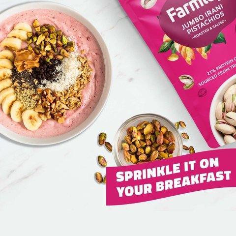 Farmley's roasted & salted pistachio is here to greet you into the world of SUPERFOOD snacking with no compromise on TASTE! Pistachios are high in protein,fiber,and antioxidants. Every bite of this roasted Pistachios has a perfect level of crunchiness & flavour that blends perfectly in your taste buds while satisfying hunger-pangs.