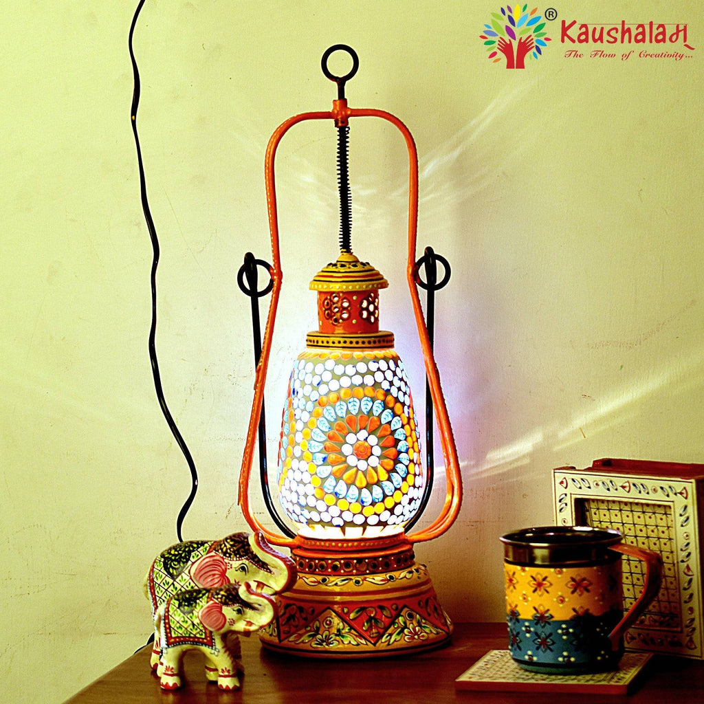 Hand Painted Lantern with Bulb : Ethnic Mosaic Bed Side Lamp Orange
