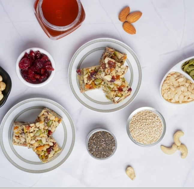 Ingredients: Cashews, almonds, pistachios, figs, dates, pumpkin seeds, sunflower seeds, ghee, cardamom