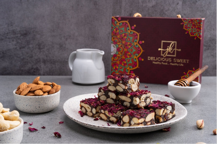 Experience the perfect harmony of tradition and innovation with JK Delicious Sweet Rose Dryfruit Bar—a luxurious mithai infused with the natural aroma of rose and packed with premium dry fruits. Crafted using almonds, cashews, pistachios, figs, dates, and fragrant rose petals, this sweet bar offers a refreshing twist on classic dry fruit treats.