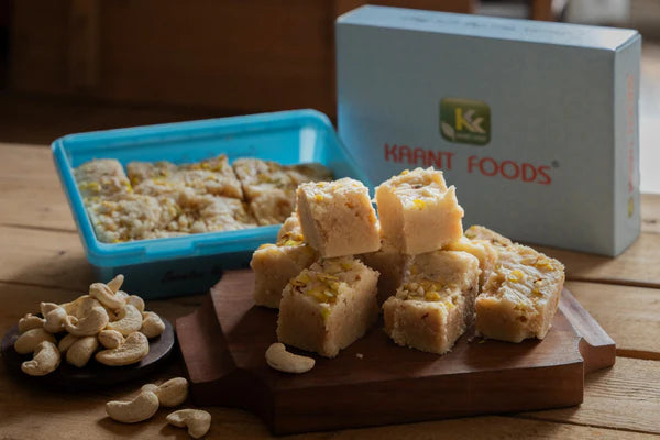 Kaant Foods likely uses premium quality cashews,Pistachio,Gir Cow Ghee,Sugar to create their Kaju Mesub, ensuring a rich and flavorful experience.
