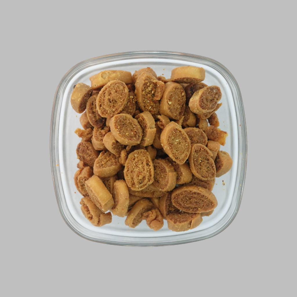 Mini Bhakarwadi are bite-sized versions of the classic Indian snack known for their spiral-shaped, savory rolls. These small delights are meticulously crafted with premium ingredients, including gram flour, spices, and a filling of shredded coconut, sesame seeds, and poppy seeds. Small Bhakarwadi offers a delightful blend of crispy satisfaction and a burst of spiciness that captivates the taste buds. They are a beloved snack, perfect for enjoying the traditional flavors of India in convenient, bite-sized portions, making them an ideal choice for snacking and sharing