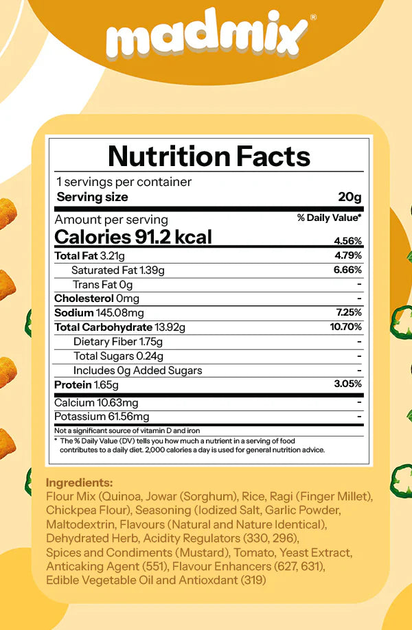 Flour Mix (Quinoa, Jowar [Sorghum], Rice, Ragi [Finger Millet], Chickpea Flour), Seasoning (Iodized Salt, Garlic Powder, Maltodextrin, Flavours [Natural and Nature Identical], Dehydrated Herb, Acidity Regulators [330, 296], Spices and Condiments [Mustard], Tomato, Yeast Extract, Anticaking Agent [551], Flavour Enhancers [627, 631]), Edible Vegetable Oil, Antioxidant (319).