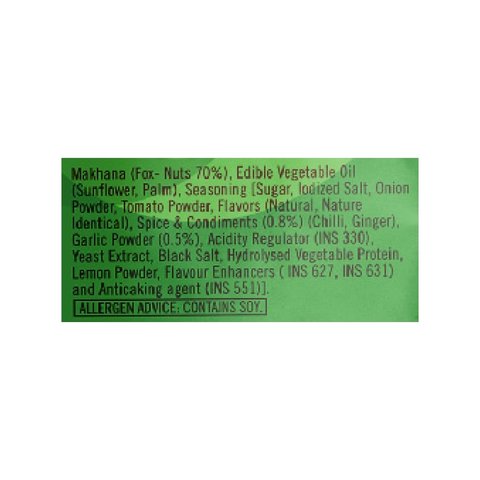 Makhana (Fox- Nuts 70%), Edible Vegetable Oil (Sunflower, Palm), Seasoning [Sugar, Iodized Salt, Onion Powder, Tomato Powder, Flavors (Natural, Nature Identical), Spice & Condiments (0.8%) (Chilli, Ginger), Garlic Powder (0.5%), Acidity Regulator (INS 330), Yeast Extract, Black Salt, Hydrolysed Vegetable Protein, Lemon Powder, Flavour Enhancers ( INS 627, INS 631) And Anticaking Agent (INS 551)].