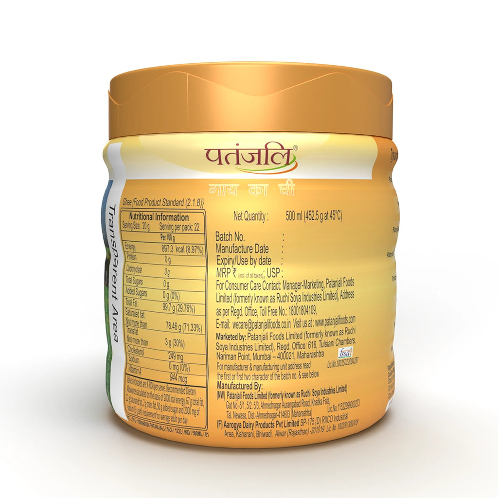 Patanjali's Cow's Ghee in a Pet Jar offers the goodness of pure and nutritious ghee. Sourced from quality cow's milk, this ghee is a staple in Indian households for its rich flavor and nutritional benefits. Packaged conveniently in a pet jar, it retains freshness and is easy to use in everyday cooking. Whether for frying, seasoning, or as a spread, this ghee ensures an authentic taste and nutritional value in every dish. Embrace the purity and nourishment of Patanjali's Cow's Ghee in the convenient pet jar for your culinary needs.