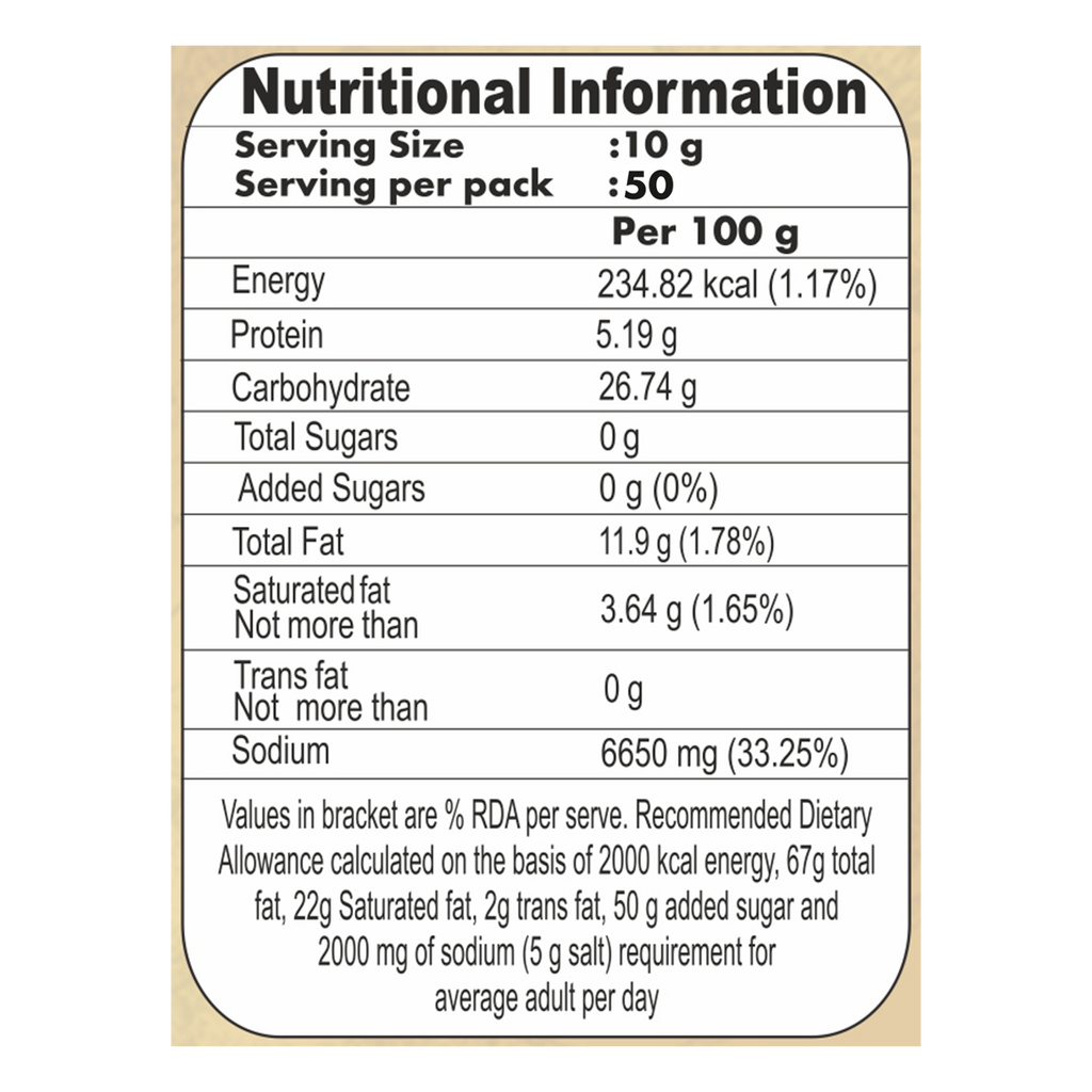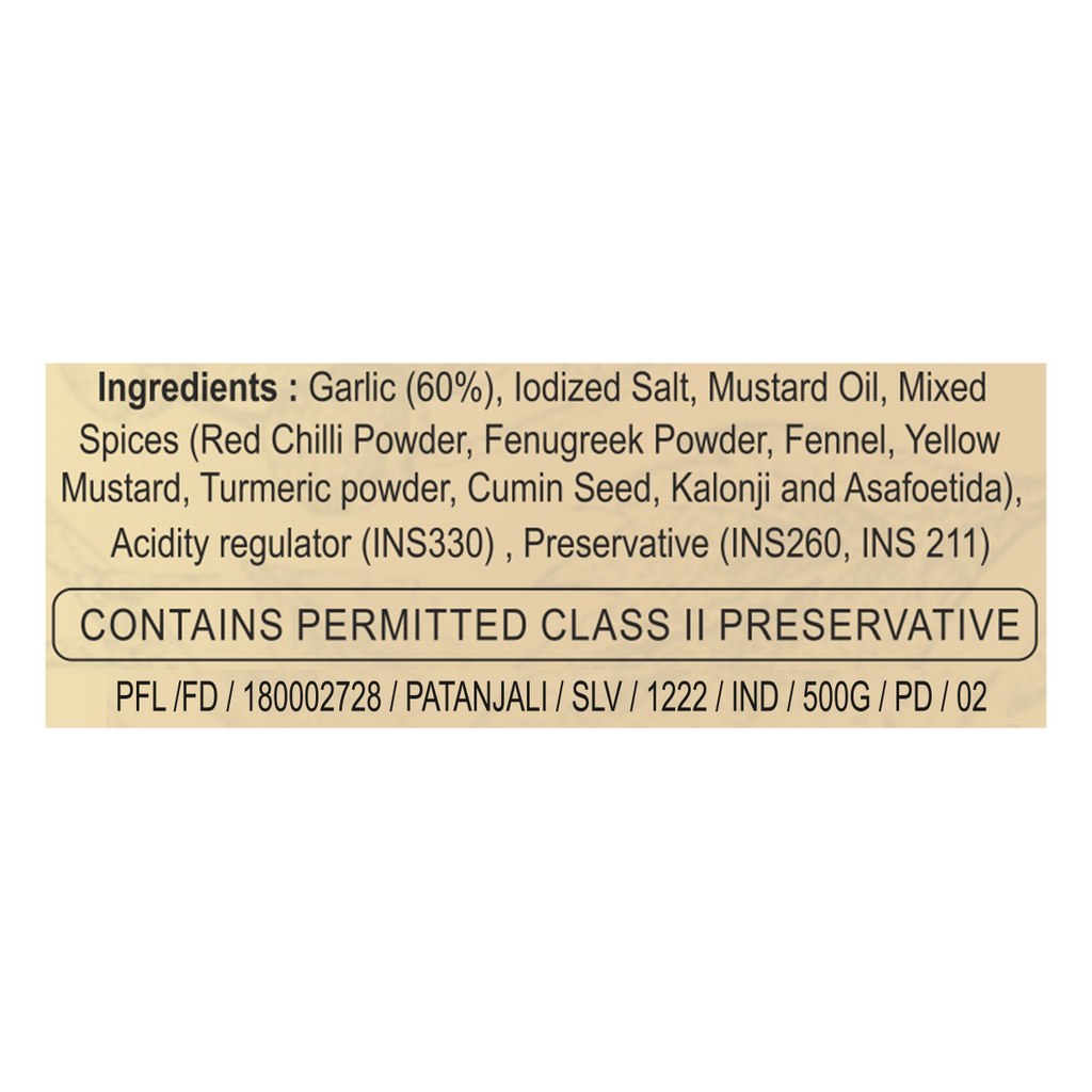 Key Ingredients - Garlic (60%), Mustard oil, Iodiazed salt, Mixed Spices (Red Chilli Powder, Fenugreek Powder, Fennel, Yellow Mustard, Turmeric Powder, Cumin Seed, Kalonji, Asafoetida), Acidity Regulator (INS 300), Preservative (INS 260, INS 211)