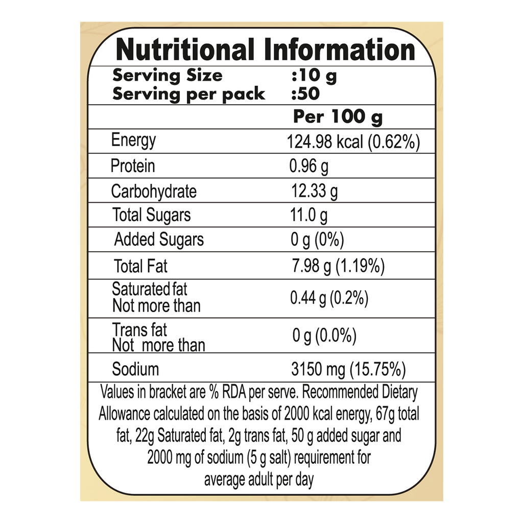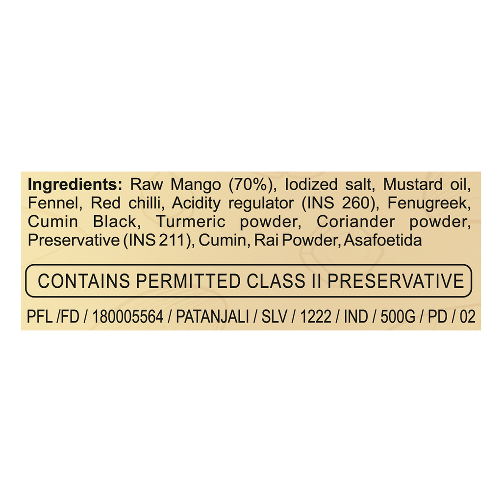 Key Ingredients - Raw Mango (70%), Iodized Salt, Mustard Oil, Fennel, Red Chilli, Acidity Regulator (INS 260), Fenugreek, Cumin Black, Turmeric powder, Coriander powder, Preservative (INS 211), Cumin, Rai Powder, Asafoetida