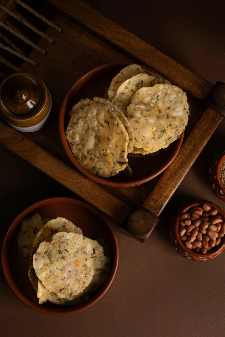 Crispy rice crackers made with lentil flour and spices, offering a crunchy and savory snack.