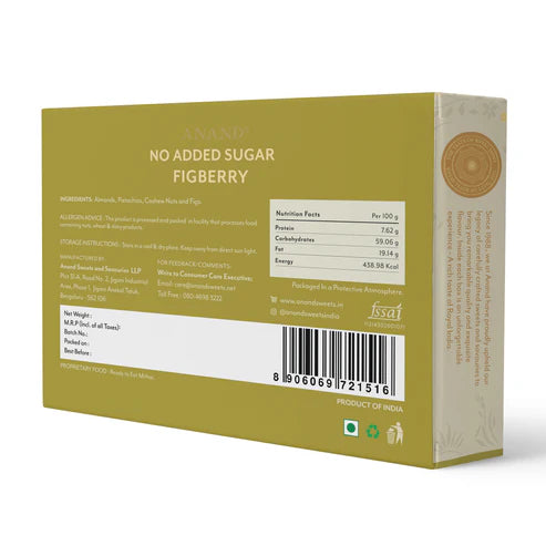 he Sugar-Free Dryfruit Fig Burfi from Anand Sweets comes packed in a corrugated cardboard box. Store these guilt-free delights in a cool, dry place after you open them, keeping them away from direct sunlight to maintain their shape, taste, and texture.