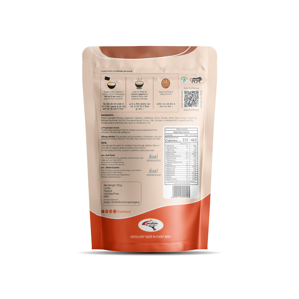Sheta Exports Pav Bhaji - 150 gms | After Cooking Gets 900 gms to Serve | Ready To Eat