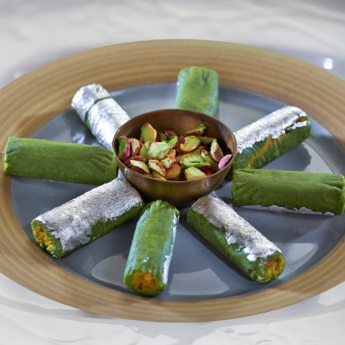 Sending sweets to friends and relatives during festivals and occasions like Diwali, Raksha Bandhan, wedding, anniversary etc. is a custom in the Indian culture. This bullet shaped sweet is a famous party menu. It is made with rich ingredients such as cashew nut powder, pistachios, silver leaves, pure ghee and sugar.