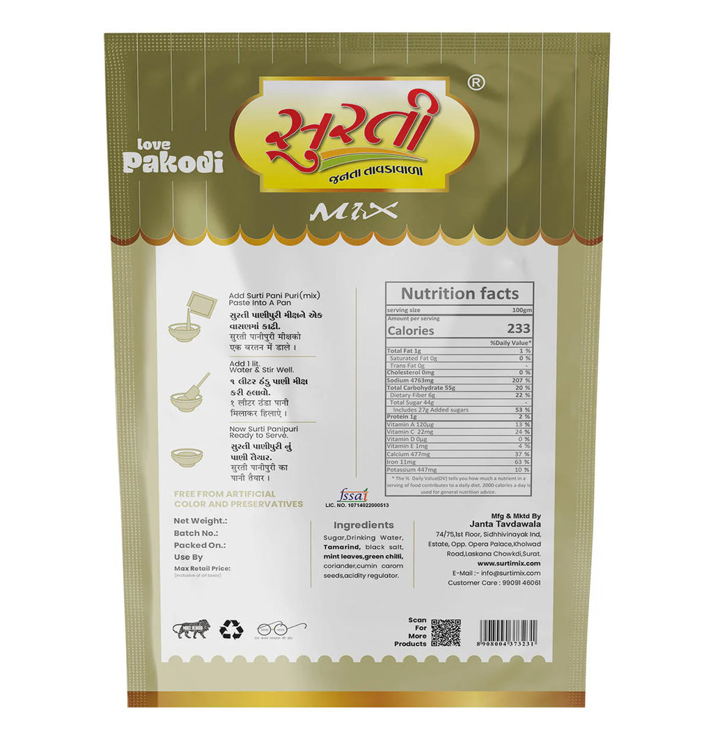 Surtimix PaniPuri | Gol Gappa | Puchka | Pakodi | Pani Patasha | Water BallsTaste brings you the true essence of Mumbai’s famous chaat!  Made with a special blend of spices and herbs, this mix creates the perfect tangy, spicy, and refreshing pani for your golgappas. No Onion, No Garlic – just pure, authentic street-style flavors in every sip. Mix with water and enjoy the ultimate chopati-style pani puri experience!