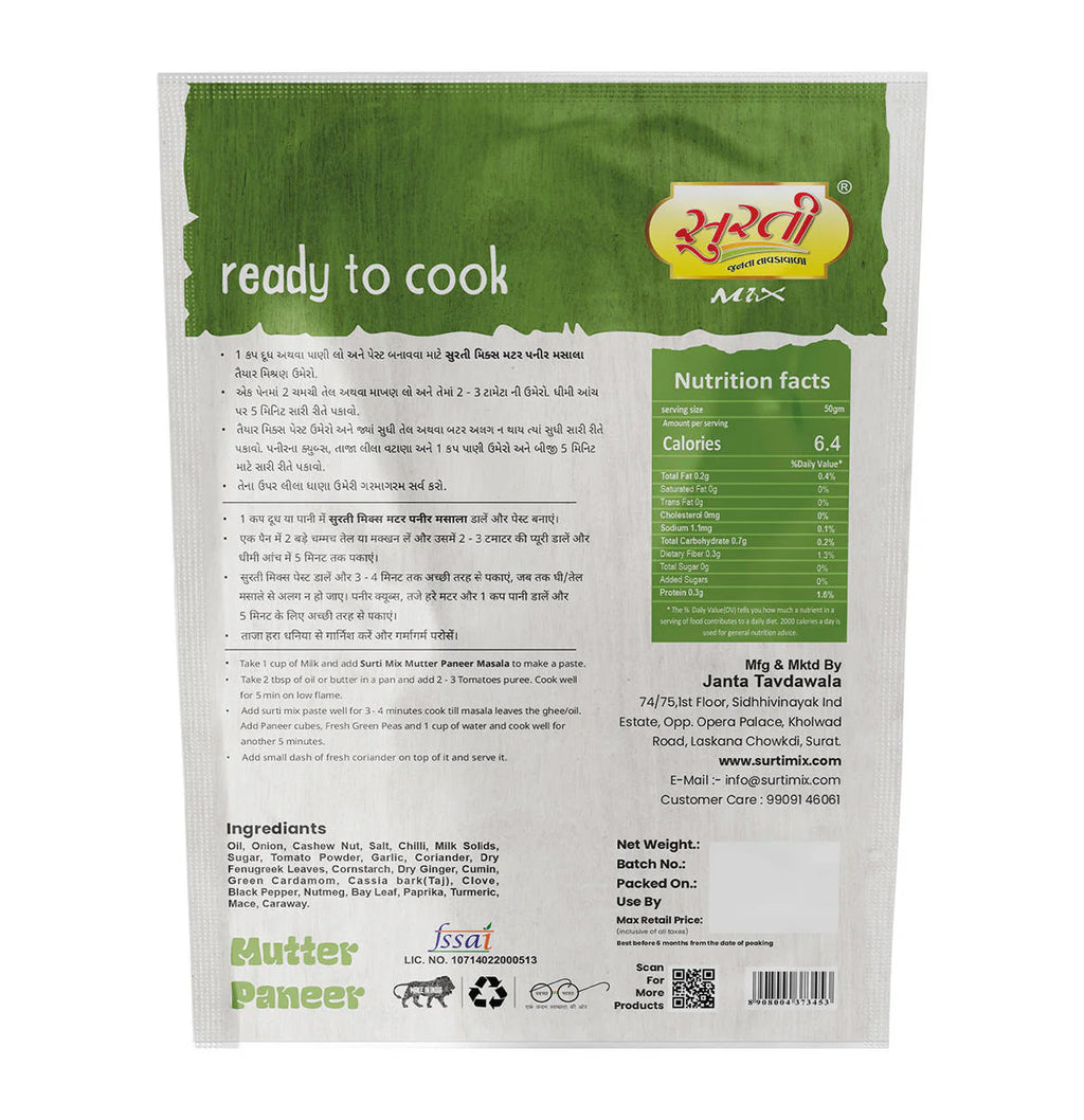 Surtimix Mutter Paneer Punjabi Sabji Gravy Masala | Ready To Eat 160 gms