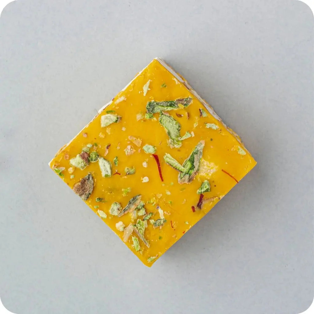 White Compound (Sugar, Edible Vegetable Fat (Hydrogenated Fat), Milk Solids, Cashew Nuts, Almonds, Pistachio Nuts ), Rice Cripsy, Saffron, Kesar, Cardamom Essence & Permitted Synthetic Food Colours.