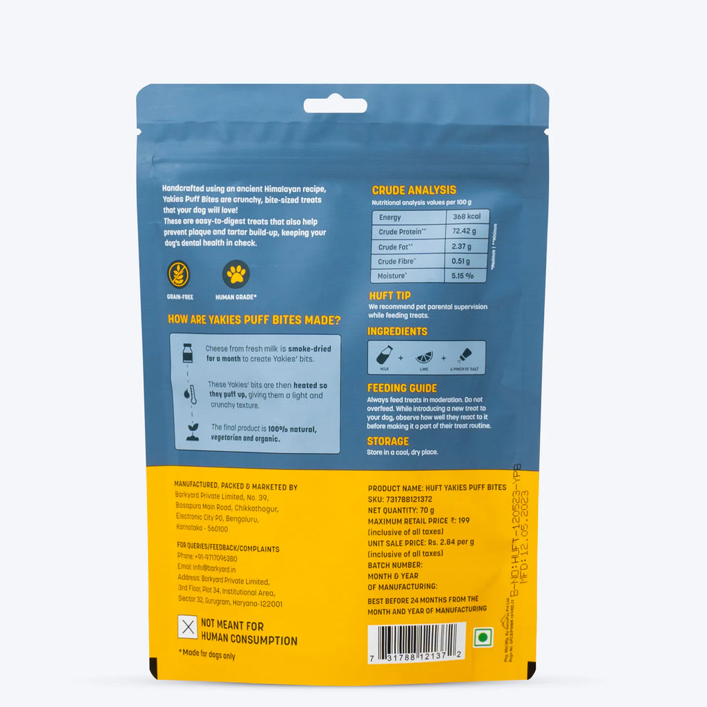 Their small, crunchy shape makes Yakies Puff Bites ideal for rewarding your pup during training sessions. Just grab a puff and treat them when they follow a command — easy, healthy, and fun!