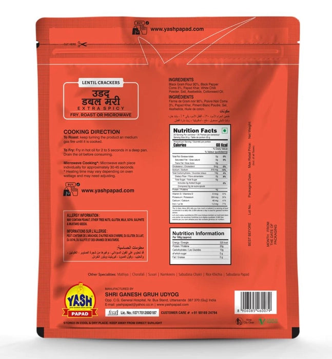 Add a fiery crunch to your meals with Yash Double Mari (Spicy) Papad | 500 gms, a traditional Indian papad crafted from premium urad dal (black gram) and generously spiced with double mari (black pepper). Known for its bold, spicy kick and crisp texture, this papad is a treat for spice lovers.