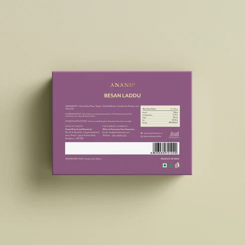 Soft and nutritious, the Anand Sweets Besan Laddus are packed in attractive boxes with the trademark Anand design evoking the ‘taste of royal India’. Stored in an airtight container and kept in a cool, dry place, the laddus stay fresh up to 6 months.