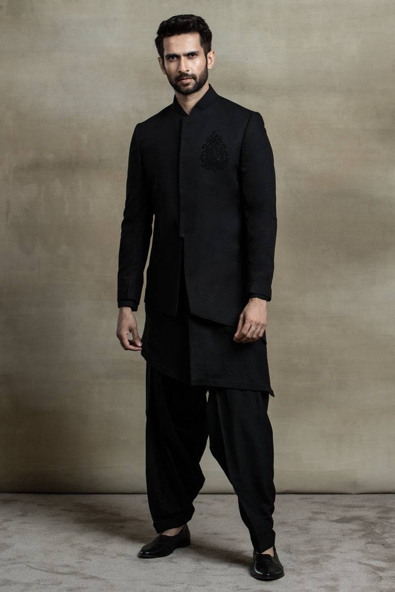 This black jacket set is an elaborate construction of draped panels to create the impression of volume and movement. An avant-garde silhouette, the jacket has asymmetric front panels and is paired here with a kurta and salwar in a matching colour.