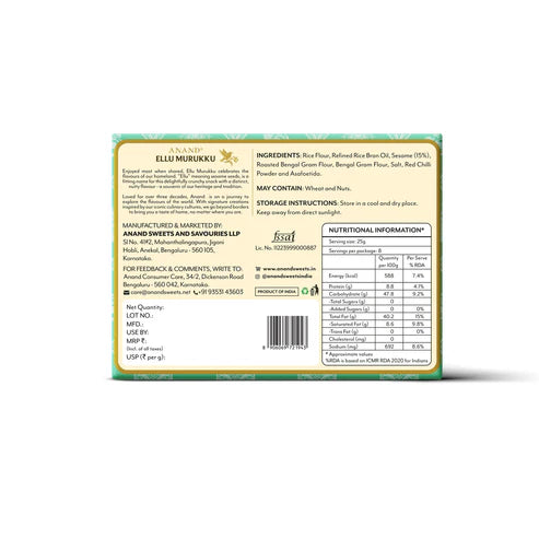 Anand Sweets Ellu Murukku comes in an attractive box decorated with miniature motifs. The packet is tightly sealed to keep the contents crispy. Anand Sweets Murukku has a shelf life of 6 months. Once opened, store the contents in an air-tight container in a cool, dry place away from sunlight.