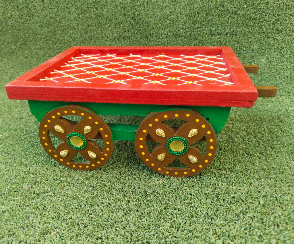 This exquisite and colourfull Dry fruit box is made in MDF/wooden work. Decorated with kundans and hand painted to create a very traditional and beautiful look. Useful Product for home use and to gift the near and dear ones.It contains 2 boxes that rest on the thela & can be moved around the table on wheels. Adds a lot of style to the decor & the beautiful piece of art can be used at a convenient place in your home.Ideal for gifting on multiple occasions to your loved ones.  Material : Wood. Color : Multicolor. Size : 22cm Long, 11cm wide & 18cm high.   2 boxes of size 3*3.5.     Care instruction : Wipe with clean and dry clothes. Don't wash with water.