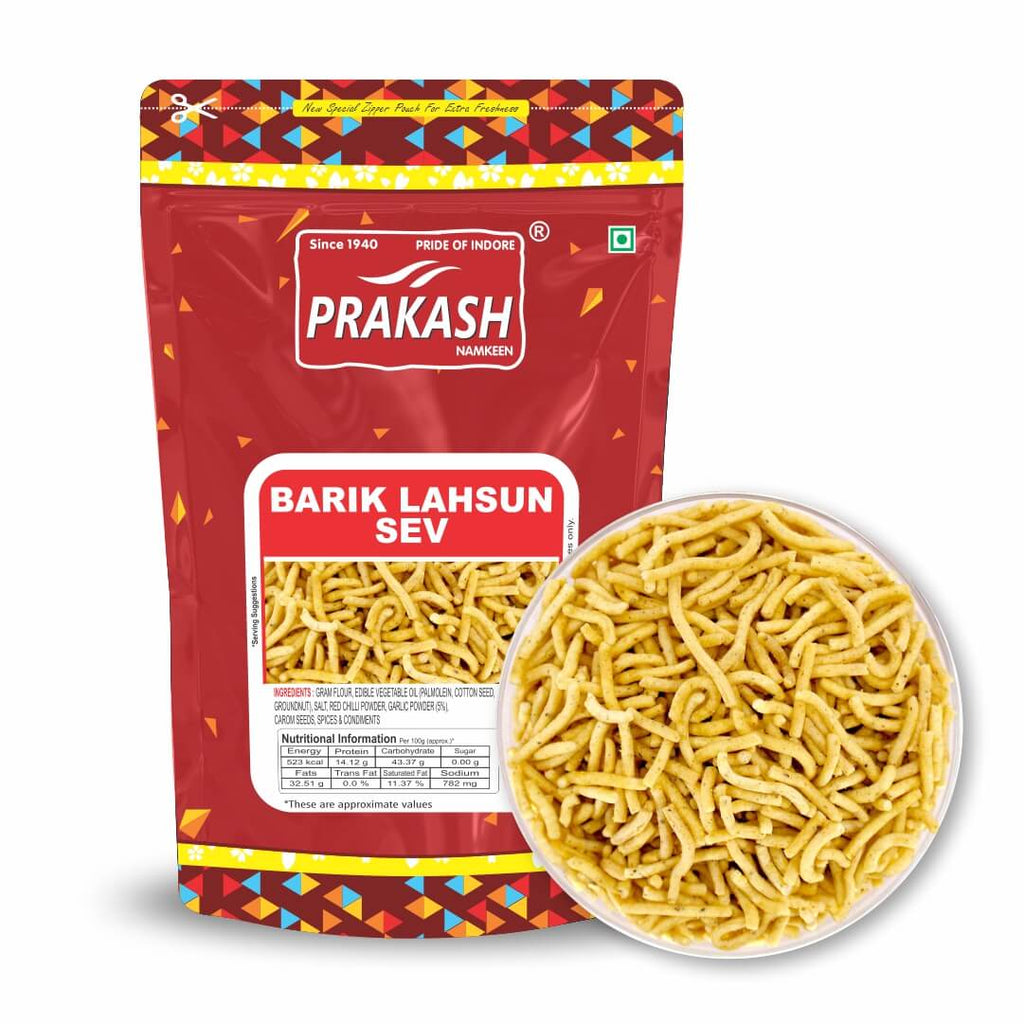 Indulge in the fiery, garlicky goodness of Prakash Namkeen Barik Lahsun Sev. This 250-gram pack is a flavorful and spicy snack that's a popular choice in Indore's culinary heritage. Crafted with precision and the finest ingredients, it's the perfect blend of crunchy texture and bold garlic flavor. Whether you're a spice lover or seeking a zesty snack to accompany your tea, Prakash Namkeen's Barik Lahsun Sev is sure to satisfy your taste buds. Order online from IndiaShopping.io and discover the bold and authentic taste of Indore in every bite.