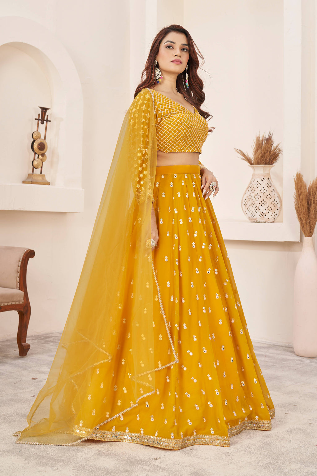 Make a stunning statement with this exquisite Women's Yellow Georgette Lehenga Choli Set, featuring intricate multi-colored thread and sequins embroidery. The lehenga is fully stitched with an attached cancan and canvas for a voluminous look. The V-neck blouse, crafted from soft georgette, complements the lehenga beautifully with its elegant 3/4 sleeves. The soft net dupatta adds a graceful finishing touch. Ideal for weddings, festive occasions, and celebrations, this ensemble combines elegance with modern charm.