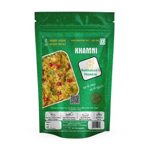 KHAMNI IS A TRADITIONAL GUJARATI SNACK MADE FROM CHANA DAL (SPLIT CHICKPEAS). THE CHANA DAL IS SOAKED, GROUND INTO A PASTE, AND STEAMED, CREATING A FLUFFY, SAVORY BASE. THIS IS THEN TEMPERED WITH MUSTARD SEEDS, CURRY LEAVES, AND GREEN CHILIES, AND GARNISHED WITH FRESH CORIANDER, GRATED COCONUT, AND SEV (CRISPY CHICKPEA NOODLES). OFTEN SERVED WITH A SQUEEZE OF LEMON, KHAMNI IS A LIGHT, FLAVORFUL DISH, TYPICALLY ENJOYED AS A BREAKFAST ITEM OR EVENING SNACK. READY TO EAT FOOD PACKETS PROVIDED BY OUR COMPANY CAN PROVIDE WITH THE AUTHENTIC FLAVOURS OF KHAMNI EVEN RESIDING IN A PLACE WHERE YOU ARE NOT ABLE TO HAVE IT, IT IS MOST USEFUL FOR PEOPLE LIVING IN ABROAD COUNTRIES WHO WANT TO SAVOUR THE TASTE OF THE AUTHENTIC KHAMNI.