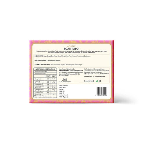The generous use of desi ghee and painstaking preparation ensures the popular sweet has a shelf life of 6 months. Place in an air-tight container, and store in a cool, dry place. The festive packaging makes the Anand Sweets Soan Papdi stand out.