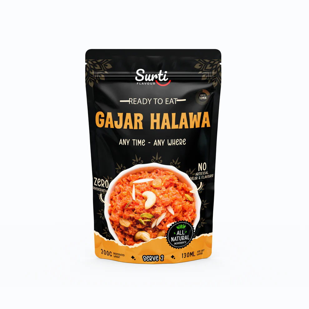 Indulge in the rich, sweet taste of Surti Flovour Special Gajar Halwo – Ready To Eat | 250 gms, a traditional Indian dessert made from fresh carrots, milk, ghee, sugar, and aromatic spices. Smooth, creamy, and naturally sweet, this ready-to-eat halwo brings the authentic homestyle taste of Gajar Halwa to your table in minutes.