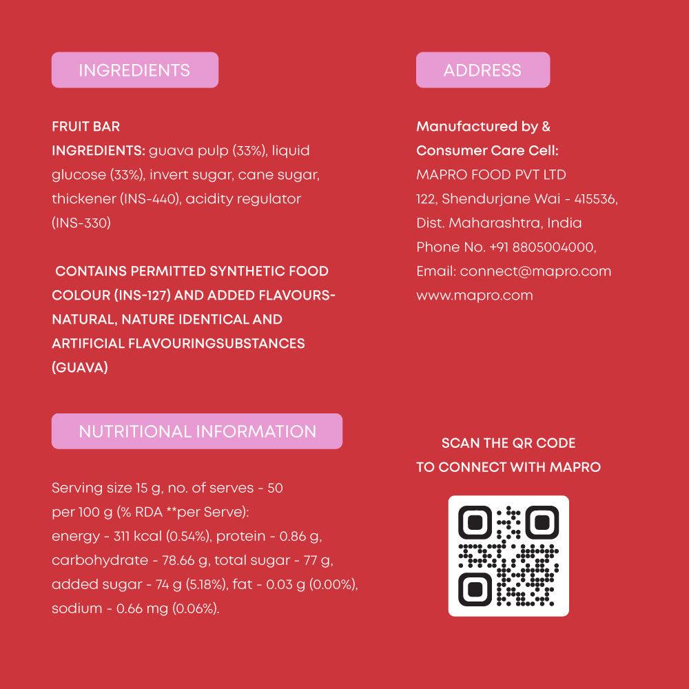 Ingredients: Guava Pulp (33%), Liquid Glucose (33%), Invert Sugar, Sugar, Thickeners (INS 440), Acidity Regulator (INS 330)