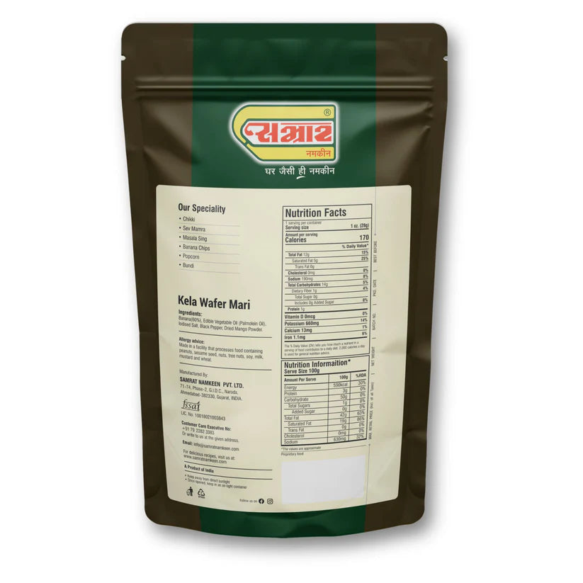 Enjoy the perfect crunch with Samrat Kela Wafer Mari Banana Chips—crispy, thinly sliced bananas fried to golden perfection and seasoned with a bold touch of black pepper. These chips strike the ideal balance between the natural sweetness of bananas and the zing of traditional Indian spices, making them an irresistible namkeen for all snack lovers.