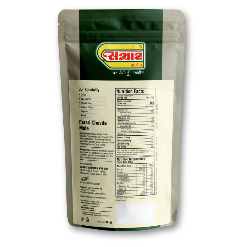 Made with premium ingredients, this gluten-free, vegetarian snack contains zero cholesterol, making it a guilt-free treat you can enjoy anytime. From family celebrations and festivals like Diwali and Raksha Bandhan to casual snacking, Samrat Farari Chevda Mola adds a delicious crunch to every occasion.