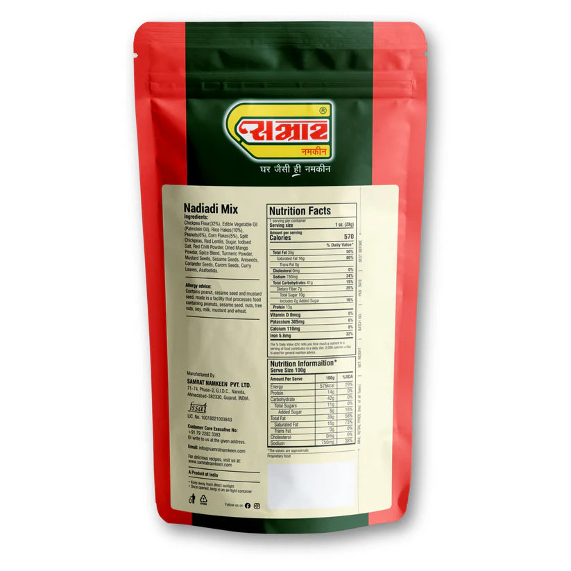 Crafted using premium-quality ingredients—including a variety of peanuts (sing, moongfali, shing, munfali, magfali)—Samrat Nadiadi Mix is a flavorful chavana (also called chevda or chawana) blended with authentic Indian spices. With zero cholesterol, gluten-free, and 100% vegetarian ingredients, it’s a healthy namkeen option for everyday snacking.
