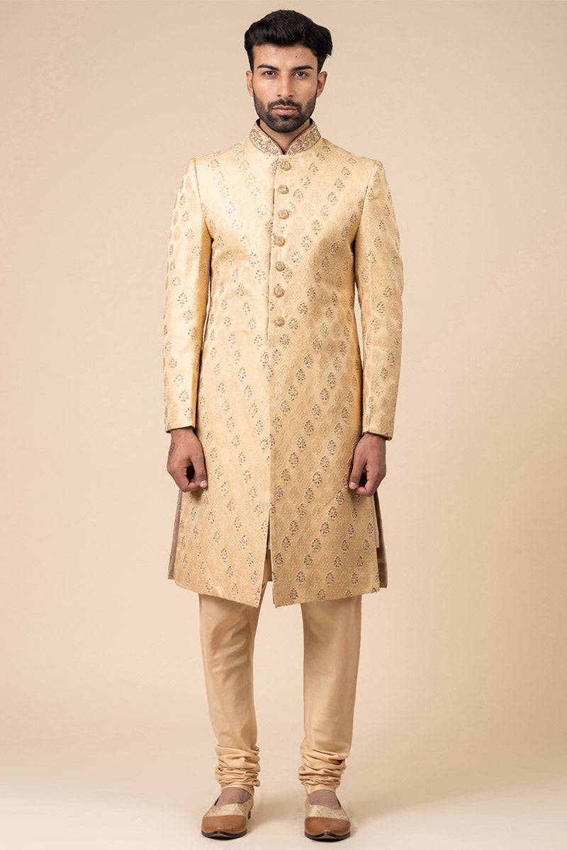 This Gold All Over Embroidered Sherwani In Brocade signals affluence in rich fabric gleaming with opulent embellishments. This brocade sherwani is an apt choice for a grand celebration in keeping with a regal theme. The jacket has intricate embroidery in a contemporary motif highlighting the rich fabric, with metallic accents on the buttons and embroidery. Wear with the matching churidar and accessorise generously to complete the aristocratic look.