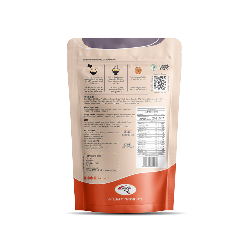 Improve your cholesterol levels along with maintaining a healthy gut within just a few minutes. Insta food Lasaniya gathiya Sabji is rich in dietary fibers and vitamins. It is made with the realness of cowpea and it also contains refined sunflower oil, powdered spices, dried vegetables and salt that amplifies the taste of this healthy sabji.