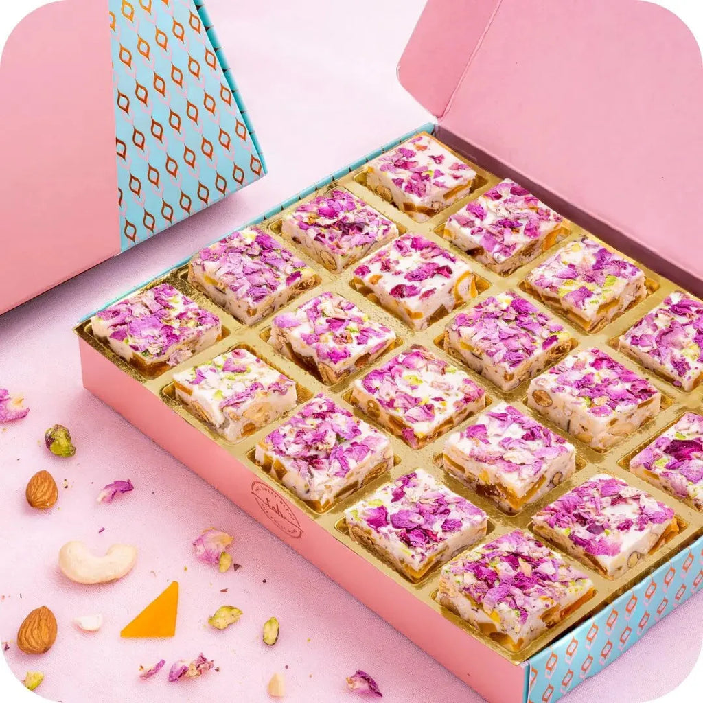 Vegetable Fat (Hydrogenated Fat), Milk Solids, Anhydrous Milk Fat, Emulsifier , Emulsifier ( Soya Lecithin,Almonds, Cashew Nuts, Pistachio), Mango, Butterscotch (Sugar, Edible Vegetable Fat Hydrogenated), Cashew & Maize Starch, Vanilla Powder, Mango Essence, Rose Petals.