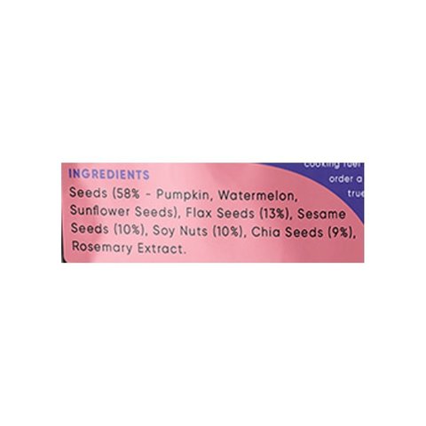 Seeds (58%- Pumpkin, Watermelon, Sunflower ), Flax Seeds (13%), Sesame Seeds (10%), Soynut (10%), Chia Seeds (9%), Rosemary Extract.