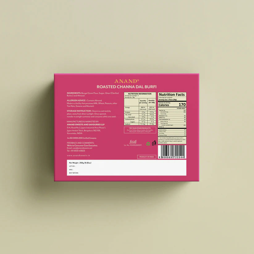 The Anand Sweets Roasted Channa Dal Burfi is packed tightly in a sealed box. This ensures the sweet retains its delicious moist freshness. The delicacy is best had within 45 days from manufacture.