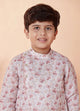 Dress him in this beige side open printed kurta set which is suited for all celebrations. The fine craftsmanship on kurta combined with embellished buttons keeps the child stylish and comfortable. Add a pair of Jutis and Safa to complete a wedding look.
