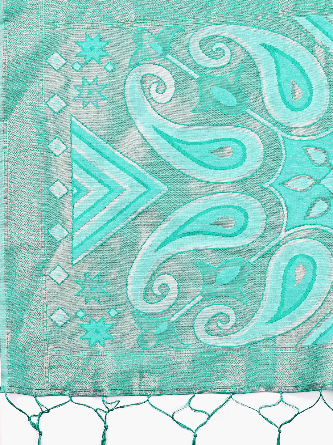 Expertly crafted, the Eira Loom Linen Cotton Saree in sea green color is perfect for any occasion. Unique loom technique creates a delicate texture, while the blend of linen and cotton ensures comfort and effortless draping. This saree comes ready to wear, adding convenience to its elegant style.