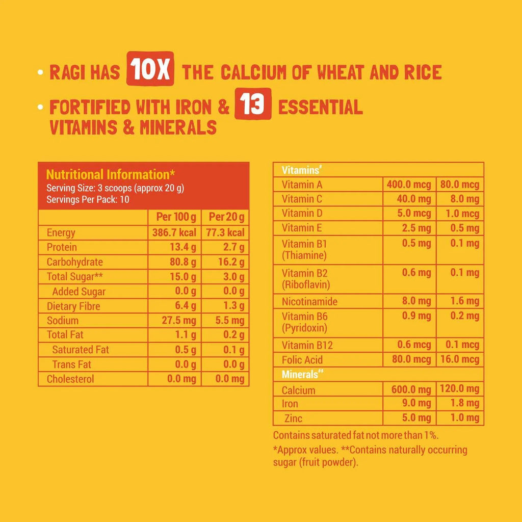 Supergrain Blend [Sprouted Ragi, Jowar, Rice] (35%), Milk Solids, Natural Mango Powder (11%), Oat Flour (10%), Date Powder, Skimmed Milk Powder, Vitamins & Minerals