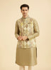 The set features a beautifully printed and hand-embroidered jacket with intricate Zardozi work, paired with a classic green kurta and pyjama. Thoughtfully curated accessories including a brooch and pocket square complete the look, making it an ideal choice for weddings, festive celebrations, receptions, and traditional events. Elevate your ethnic wardrobe and channel timeless royalty with this sophisticated outfit.